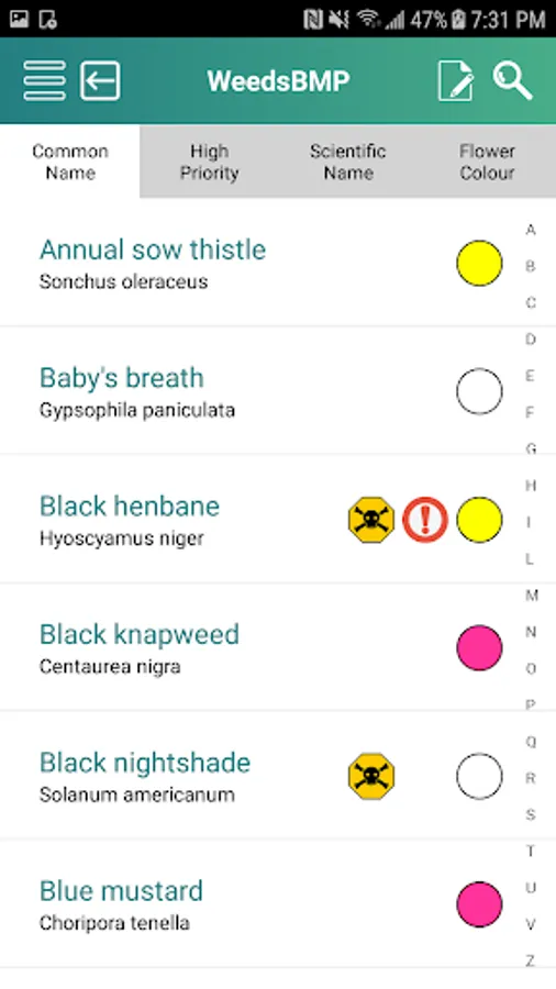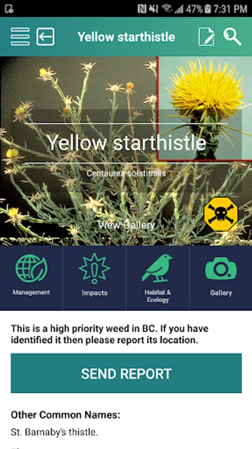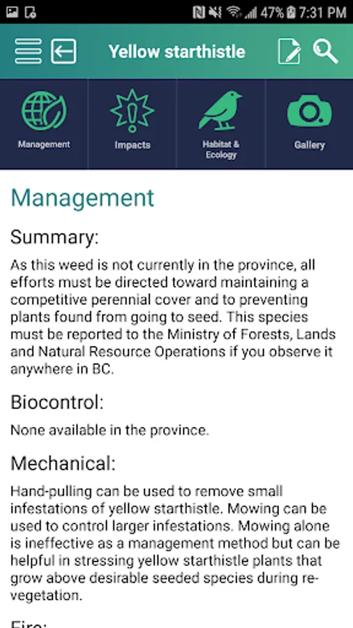 The WeedsBMP app was developed as a management tool for livestock and forage producers in BC to successfully identify and manage invasive plants to minimize impacts on operations. WeedsBMP includes identification and management information for 95 invasive plants. Users can search the app by common name, scientific name, and by flower colour to correctly identify an invasive plant and learn how to manage it. The plants are divided into two groups: 1) grasses, sedges and rushes; and 2) broad leaf plants. For each species, detailed information is provided on identification, habitat and ecology, impacts, and management options. WeedsBMP also includes a summary of provincial and regional invasive plant contacts from across the province.