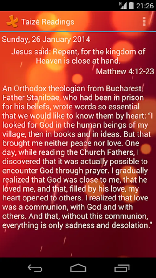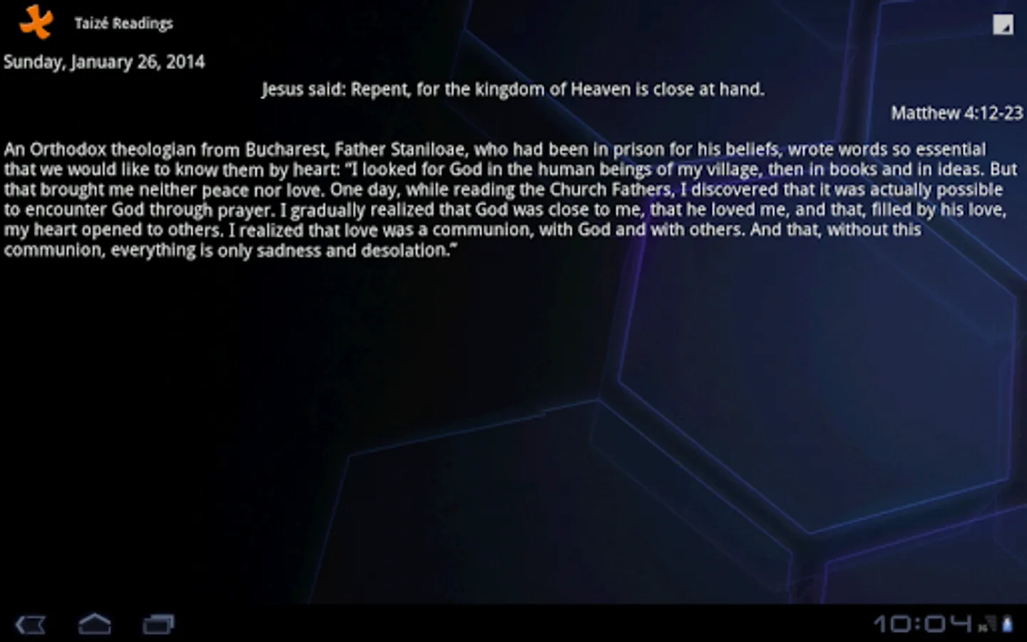 Short Bible readings read each midday at community prayer in Taizé. Also includes a short daily meditation by brother Roger (unconnected with the Bible text). The application works offline: texts updates are downloaded from the Internet.