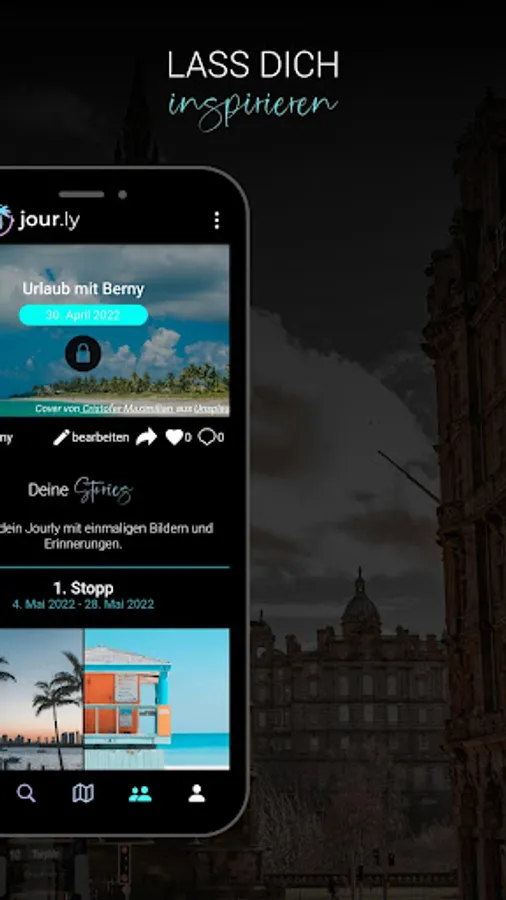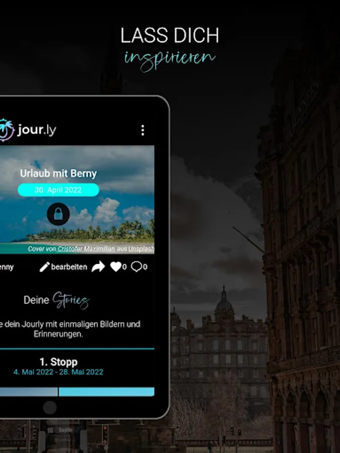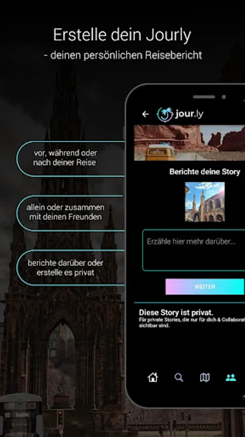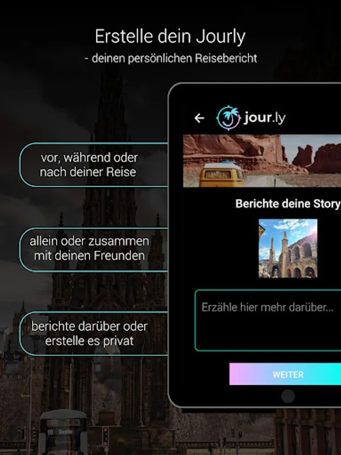 You can share all unforgettable moments as stories in your journal. Inspire others and report about your adventures and experiences. Wonderful places, a beautiful city, a beautiful parking space/rest area or location, a recommendable restaurant... the decision is entirely up to you. Would you like to keep your Jourly or individual stories just for yourself or share an insider tip only with your friends? Then simply set it to “private”.