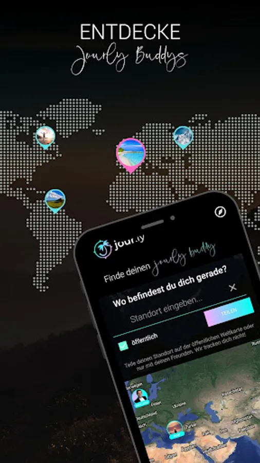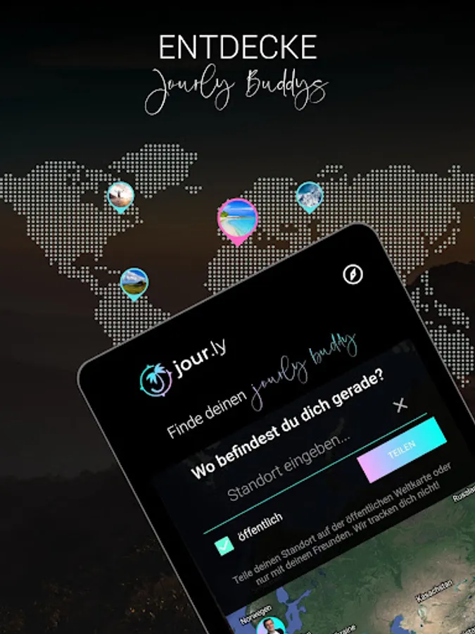 Connect on the Jourly Map and search for like-minded people nearby. Are you looking for a Jourlybuddy? Then share your location and exchange ideas with others.