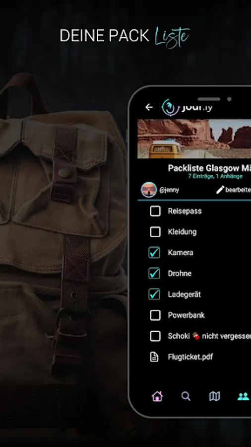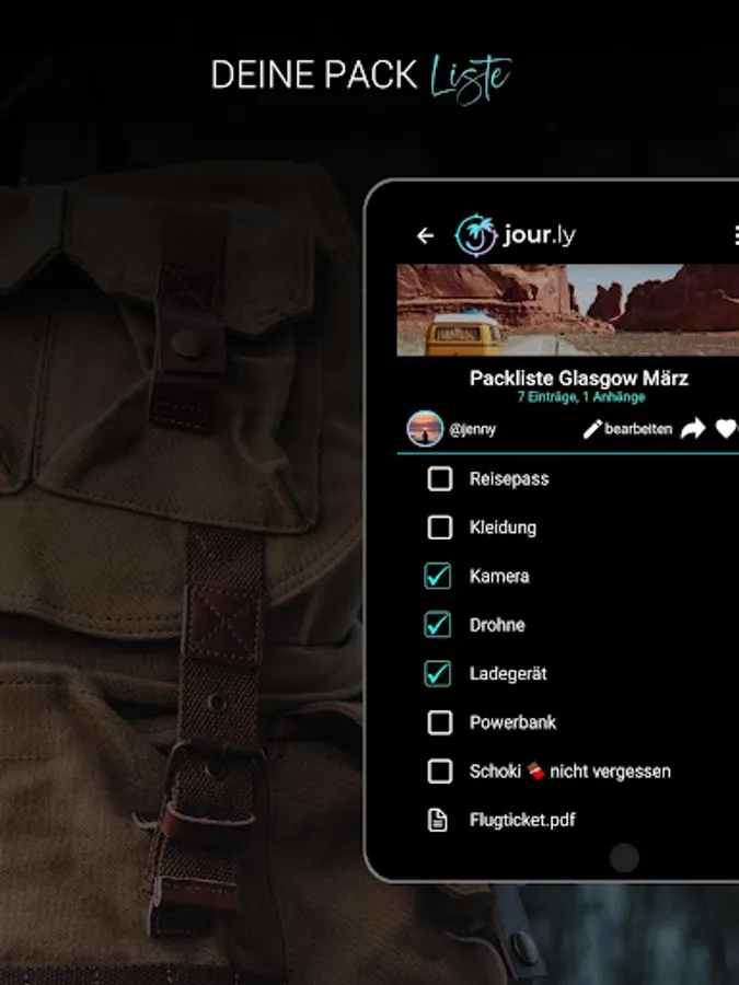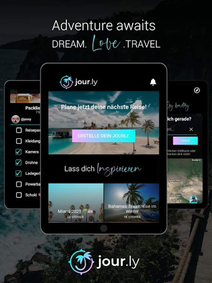The anticipation is huge, the positive energy palpable and creativity blossoms just before the start of your journey. Plan your stops and create your packing lists. Use the upload function to have all documents ready during your trip. Your Jourly can be anything from a simple day trip, a day trip to a great location to a road trip or a trip around the world. You decide what your Jourly will look like. Unleash yourself and start your first Jourly!