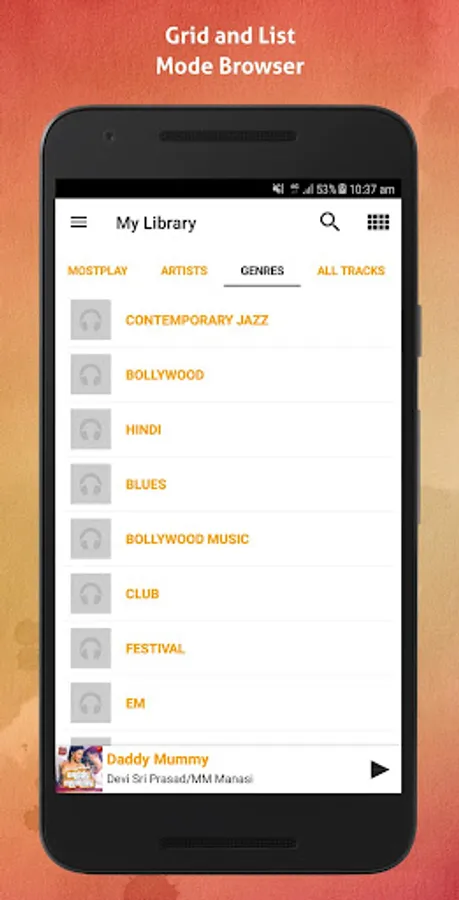 • User can browse and play music by albums, artists, songs, playlists, folders