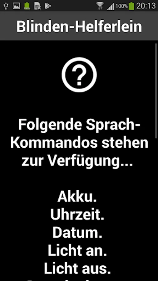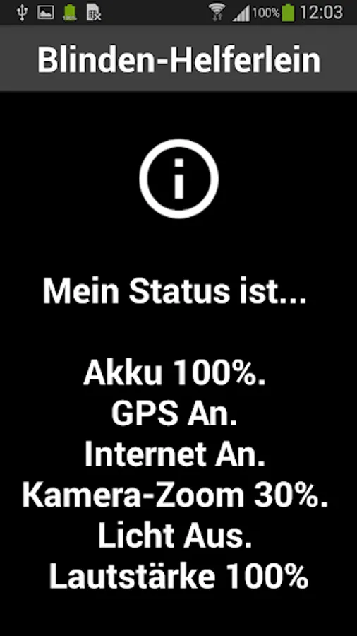 The current battery status of your smartphone is read out and output by voice. If the battery level is below 30%, you will receive a warning to connect the device to a power supply as soon as possible.