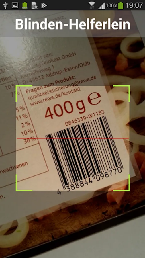 An EAN barcode is scanned via your smartphone camera and evaluated in plain text online via product comparison portals. A returned item description will then be announced to you by voice output.