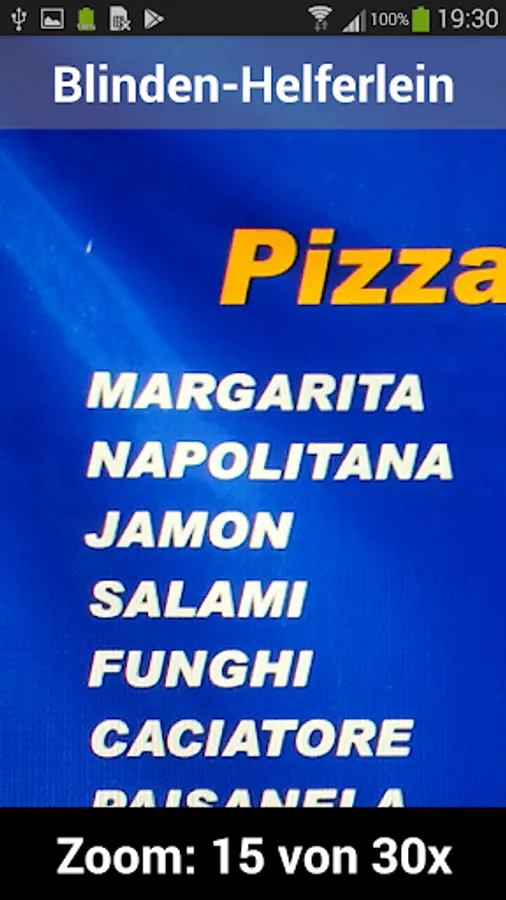 A magnifying glass is implemented using your smartphone camera. Use the "Touch" on the screen to move two fingers apart or together to set the desired magnification. The possible zoom levels depend on the hardware of your smartphone.