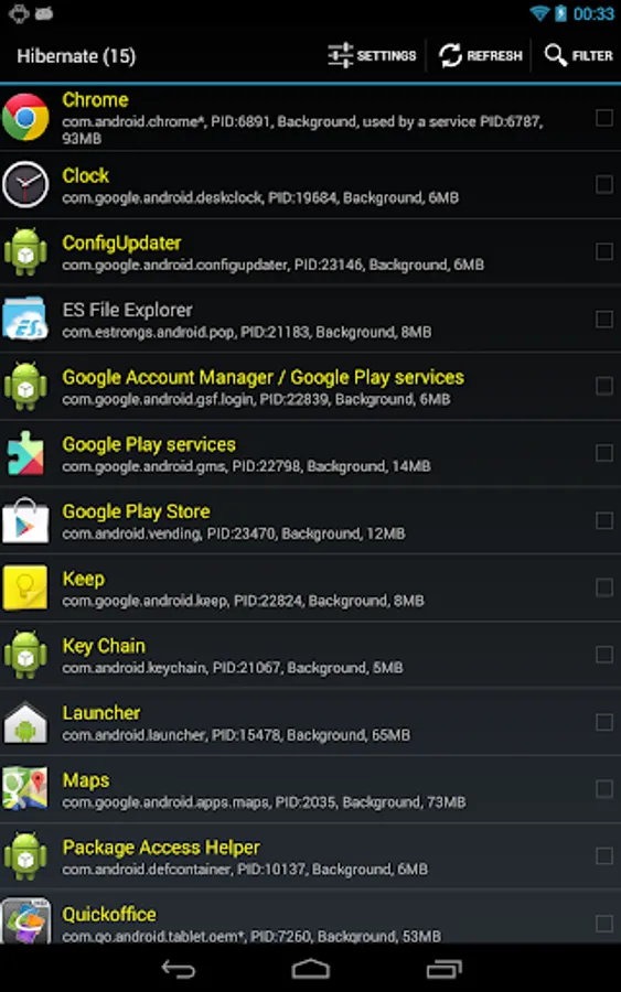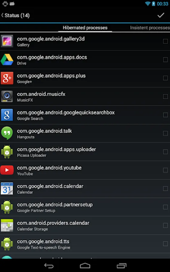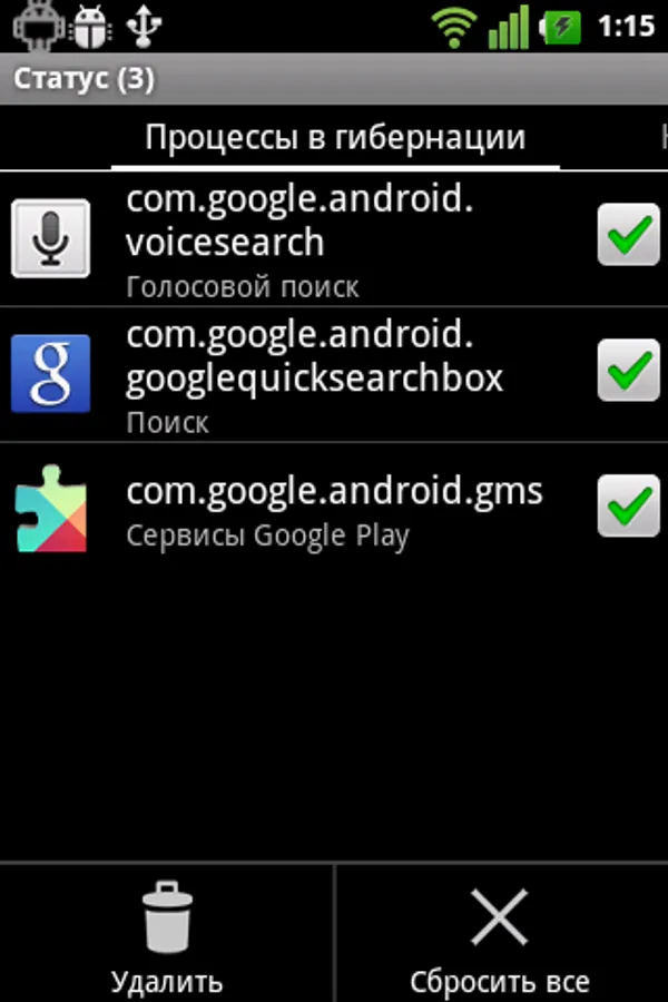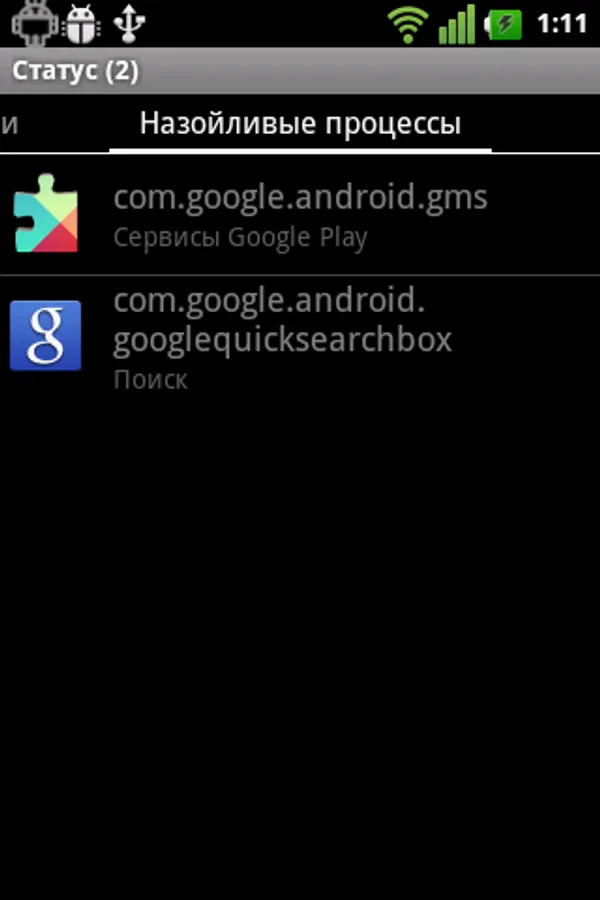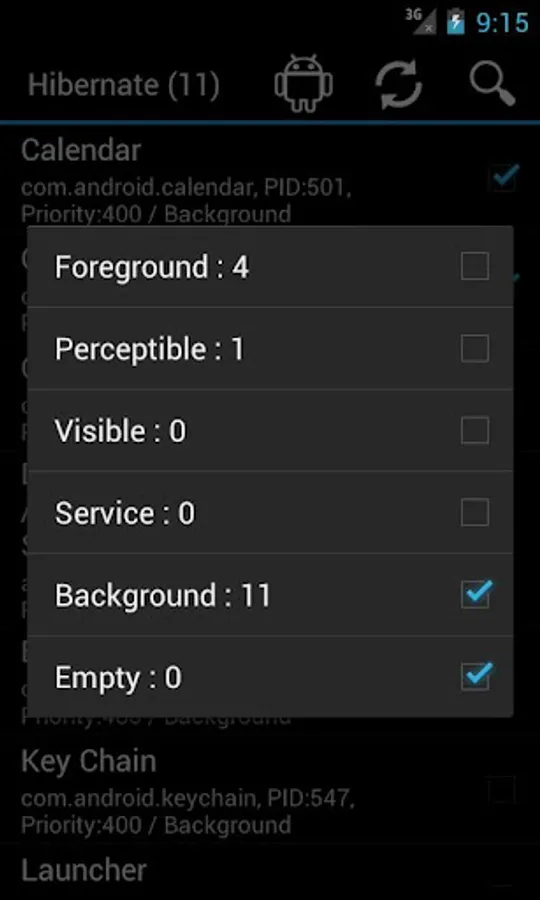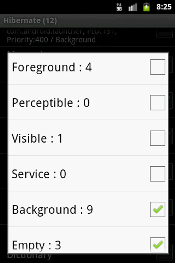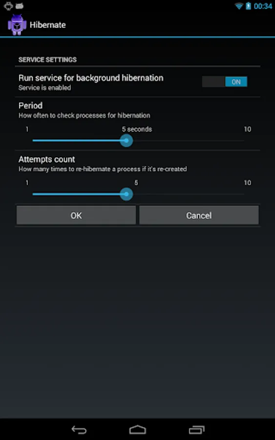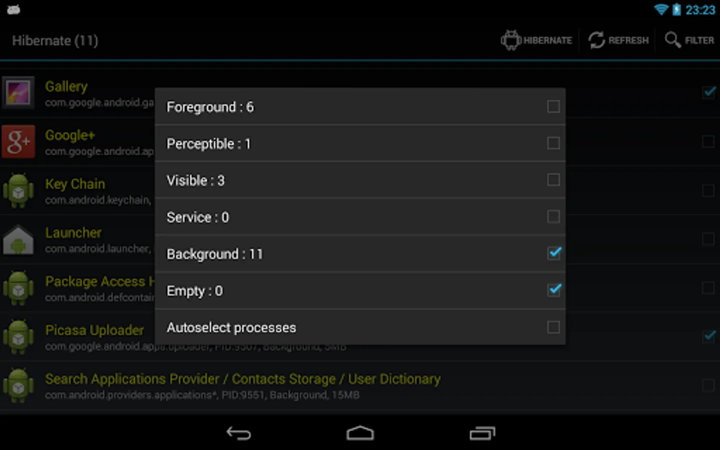 The app supports a service mode allowing for automatic background hibernating of specified processes. Attention: use the service mode with a caution. If some of hibernated processes are recreated constantly by themselves, the service may exhaust the battery.