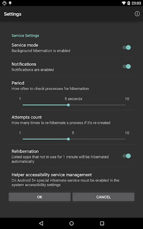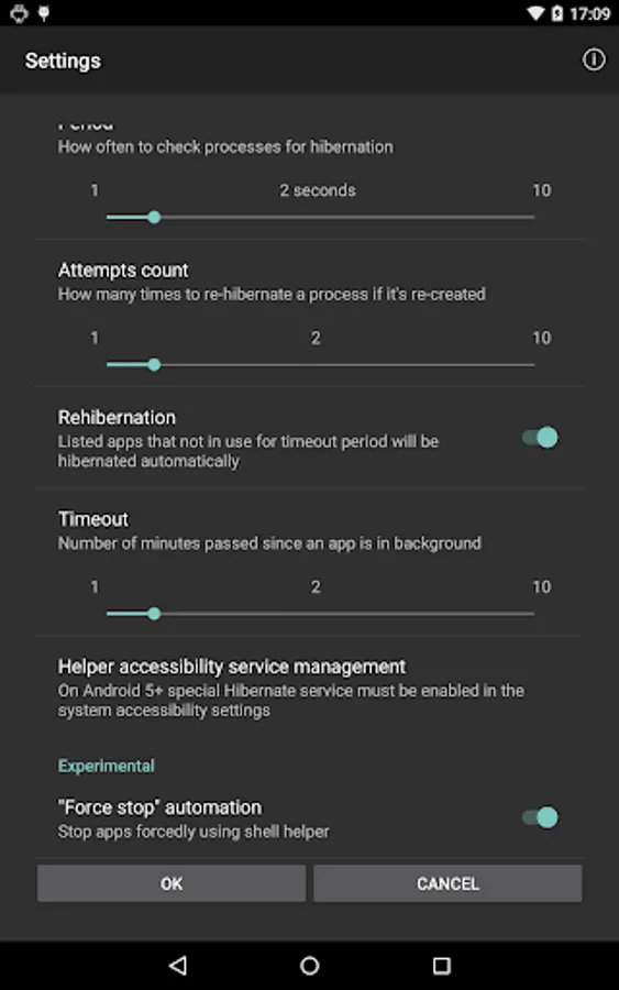 WARNING! On Android 5+ active tasks can not be monitored anymore by system design. As a workaround, Hibernate does now provide a special accessibility service, which must be enabled manually by user in the system Accessibility settings. Without this hibernation service will not function properly on Android 5+.