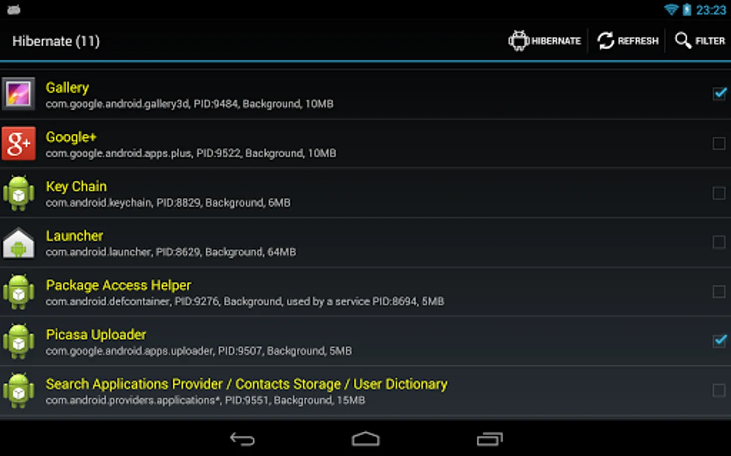 Hibernate is a small utility which allows you to hibernate selected background processes. It "kills" them by means of "killBackgroundProcesses" used internally by Android to free up resources. This method differs from killing applications in the system list of running processes in the way, that it allows applications to save their state before exit, so when you return to the hibernated process back, it will be restored to its previous state.