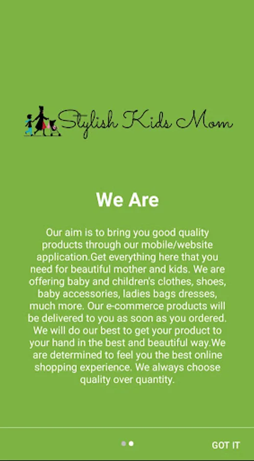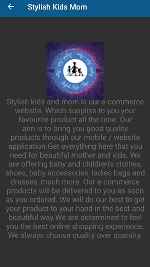 Our aim is to bring you good quality products through our mobile/website application.Get everything here that you need for beautiful mother & kids. We are offering baby and children's clothes, shoes, baby accessories, ladies bags & dresses, much more. Our e-commerce products will be delivered to you as soon as you ordered. We will do our best to get your product to your hand in the best and beautiful way.We are determined to feel you the best online shopping experience. We always choose quality over quantity.