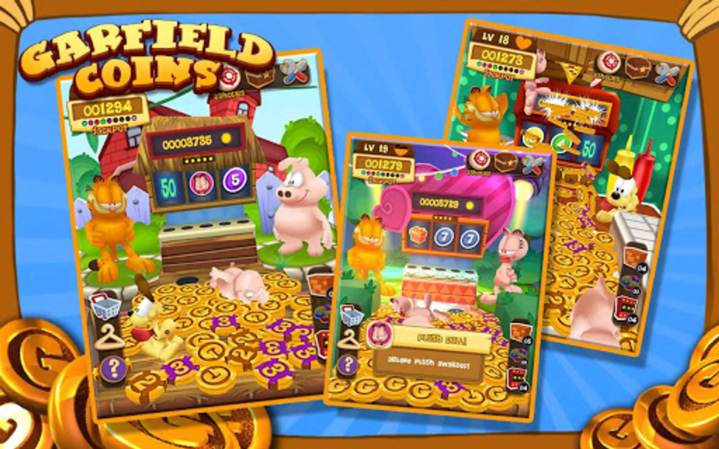 The world's favorite lazy cat meets one of the great coin-operated classics! Garfield's Coins is a fresh take on the popular arcade classic coin pusher games. Players help Garfield to push coins, tokens and various prizes into the collection area by strategically dropping coins into the mechanism. You only have a limited amount of coins to spend per day, and objects that fall off the sides of the tray are lost forever, so play smart using plenty of strategy and various special abilities!