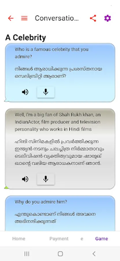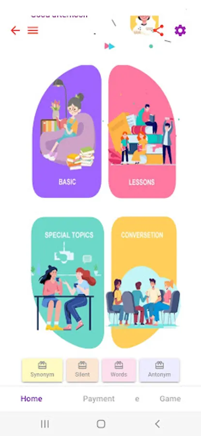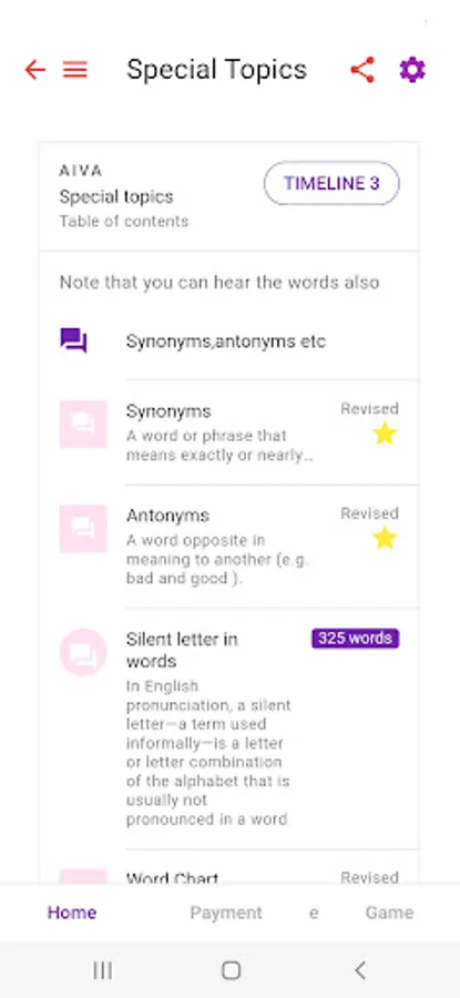 Malayalam to English Spoken English app with 37 sets of lessons, 62 Conversational special topics, synonyms, antonyms , word charts and speech recognition and tts