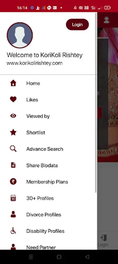 Features include profiles from all over India, age groups, profession groups, divorce groups, etc.