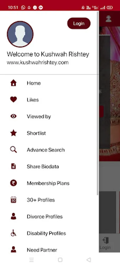 Features include profiles from all over India, age groups, profession groups, divorce groups, etc.