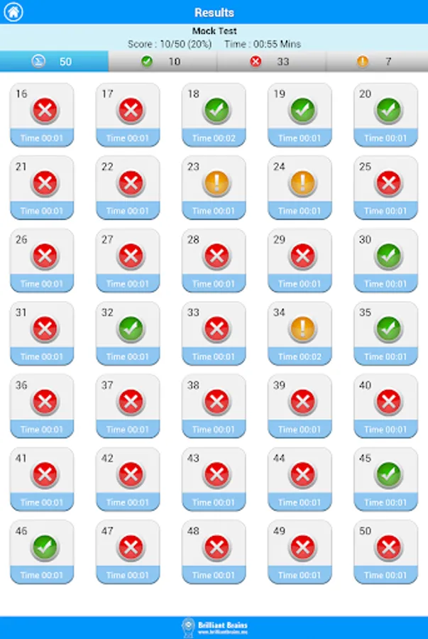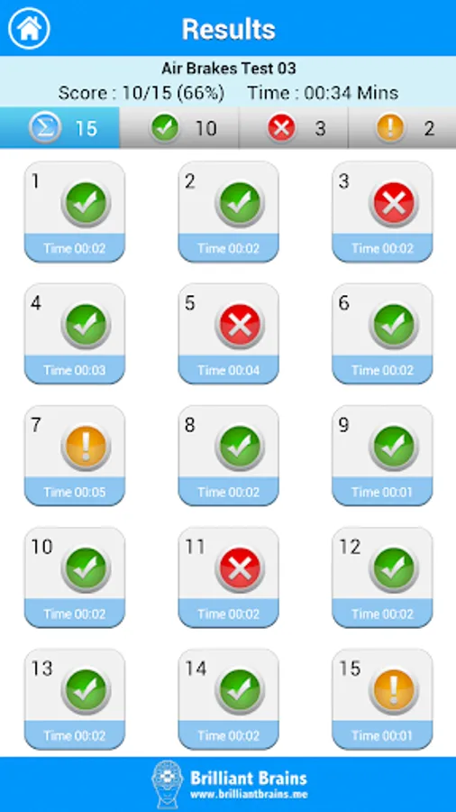 A summary of the practice test is presented at the end of each test. It shows you the time you took, the score, which questions you answered correctly and where you were wrong.