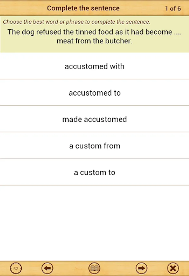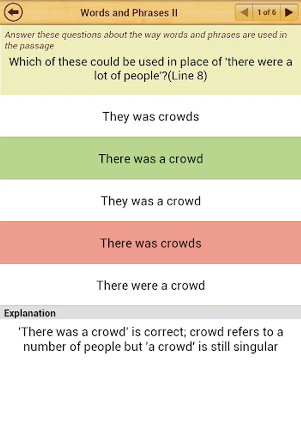 After you have practiced all types of questions, you can take a Mock Test with 50 questions. The Mock Test has questions selected randomly from each topic. Scores for the mock tests taken in the past are displayed in a bar chart. This is a great way to track how you are progressing in mock tests. There is no limit on how many mock tests you can take.