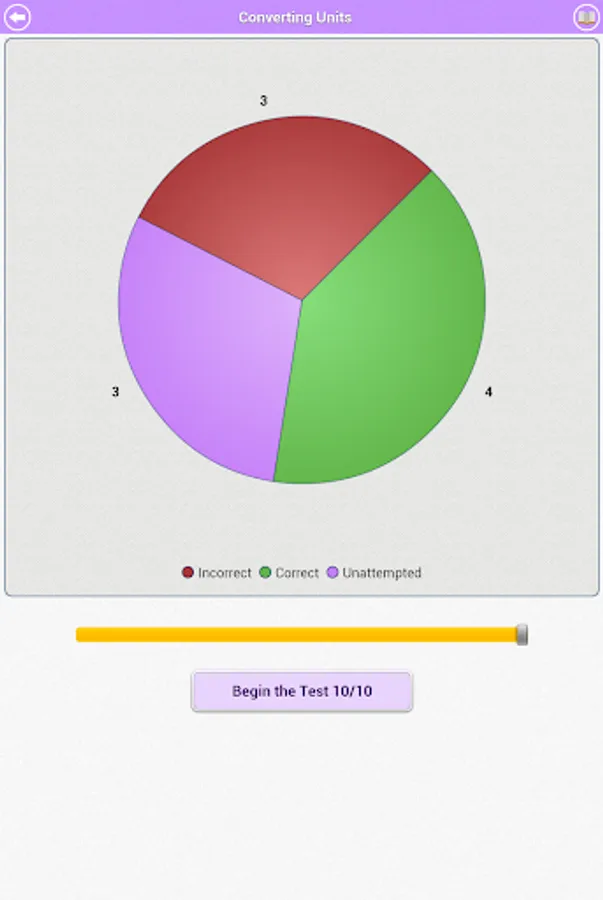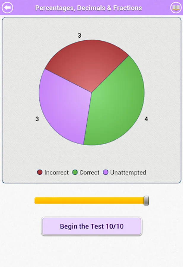 An interactive pie chart displays current progress for each topic. You can touch the different color slices of the pie and choose if you wish to answer only incorrectly answered questions, unattempted or correctly answered questions. This feature is very useful to achieve 100% score in each topic.