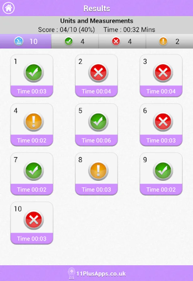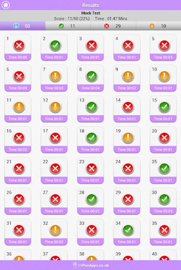 On the completion of each test the user is given a summary of questions answered correctly, incorrectly and skipped along with the time taken on each question. Every question can be reviewed and all questions have an explanation of the answer.