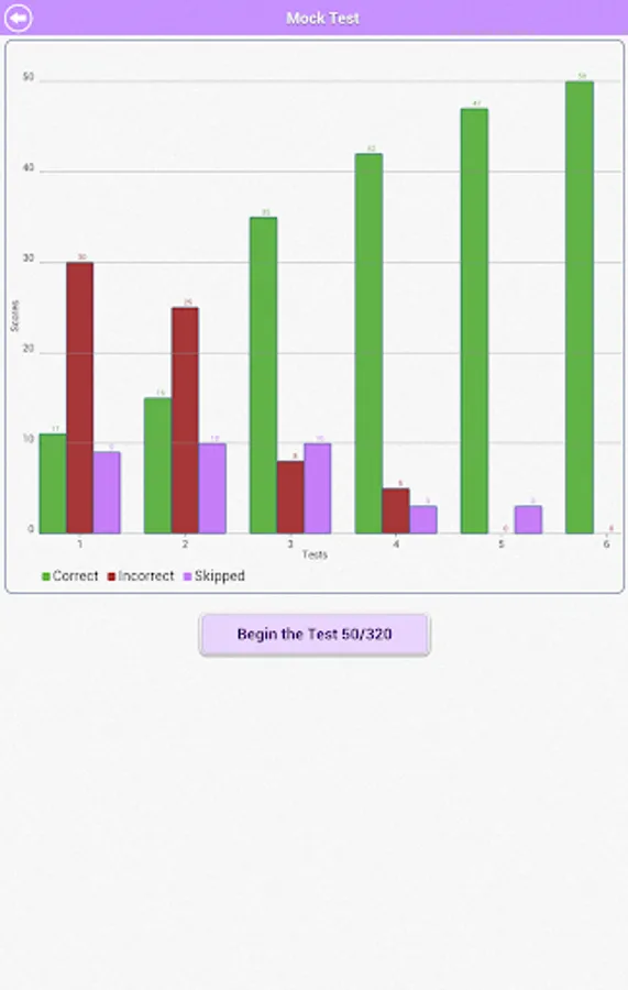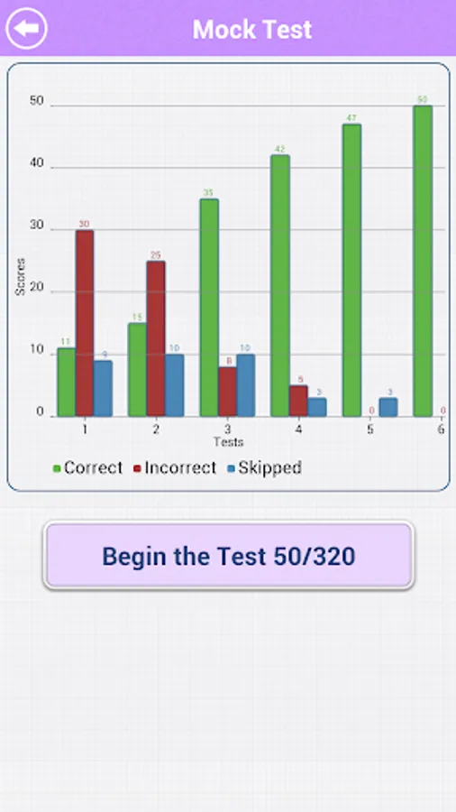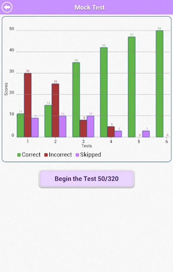 After you have practiced all types of questions, you can take a Mock Test with 50 questions. The Mock Test has questions selected randomly from each topic. Scores for the mock tests taken in the past are displayed in a bar chart. This is a great way to track how you are progressing in mock tests. There is no limit on how many mock tests you can take.