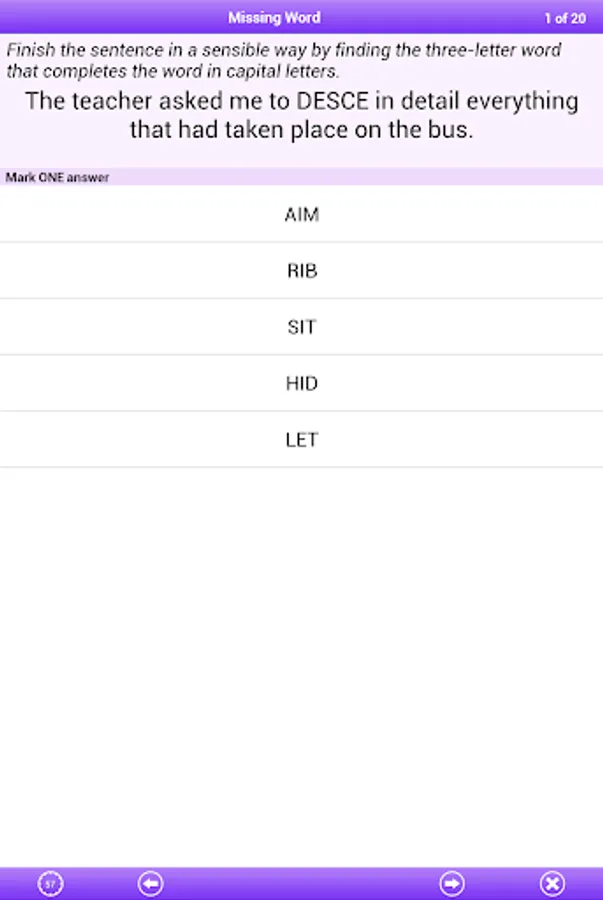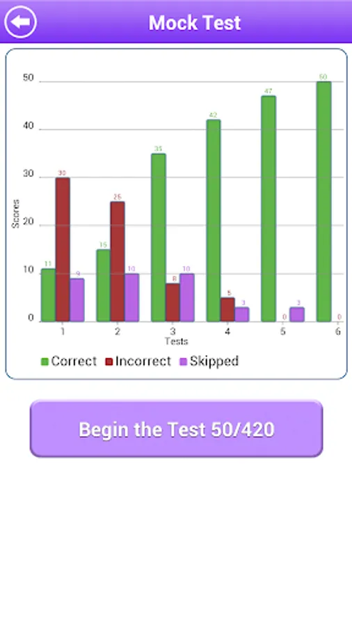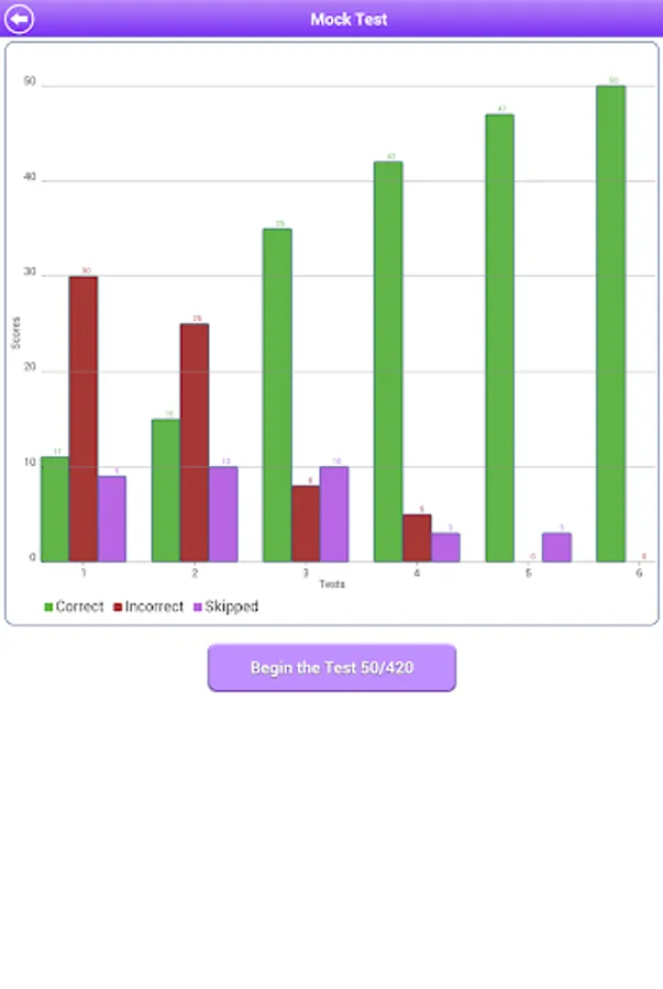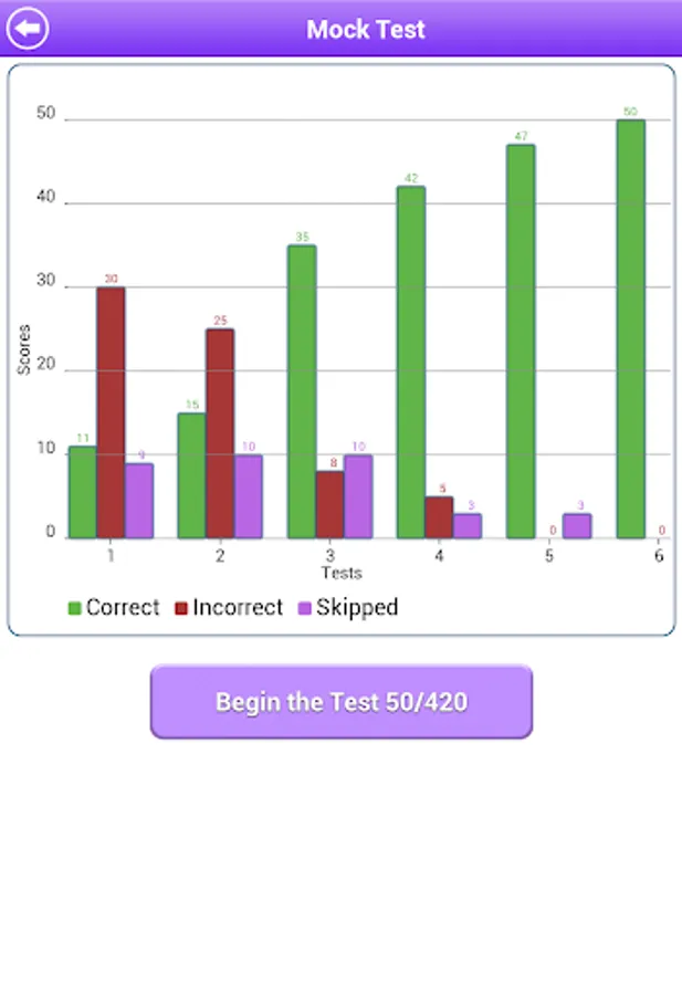 After you have practiced all types of questions, you can take a Mock Test with 50 questions. The Mock Test has questions selected randomly from each topic. Scores for the mock tests taken in the past are displayed in a bar chart. This is a great way to track how you are progressing in mock tests. There is no limit on how many mock tests you can take.