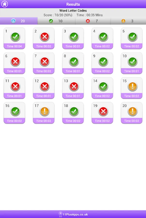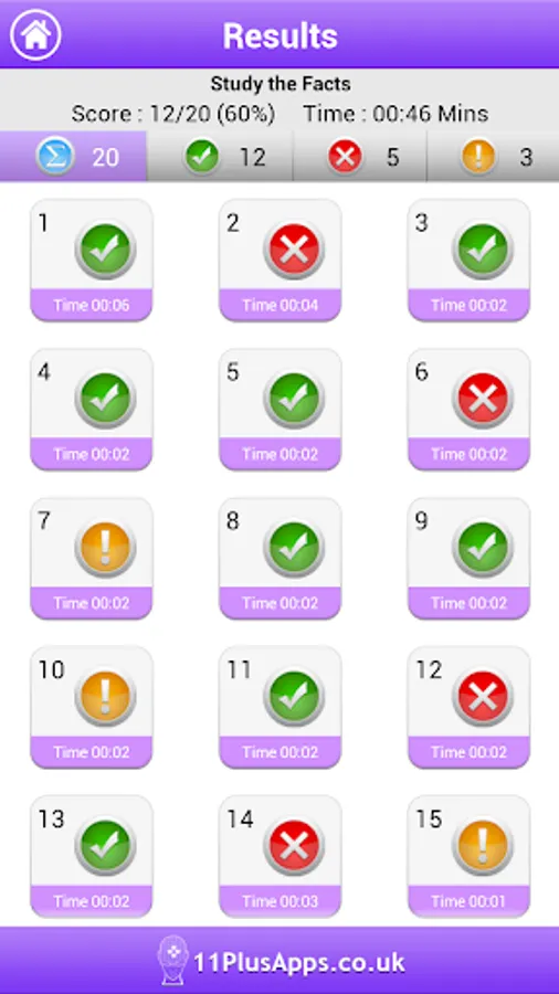 On the completion of each test, the user is given a summary of questions answered correctly, incorrectly and skipped along with the time taken on each question. Every question can be reviewed, and all questions have an explanation of the answer.