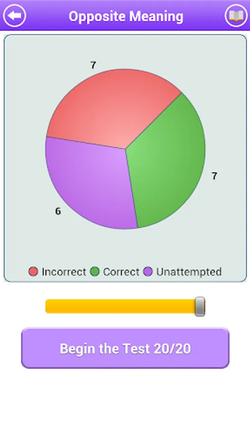 An interactive pie chart displays current progress for each topic. The user can touch the different color slices of the pie and choose to answer only incorrectly answered questions, unattempted or correctly answered questions. This feature is very useful to achieve 100% score in each topic.