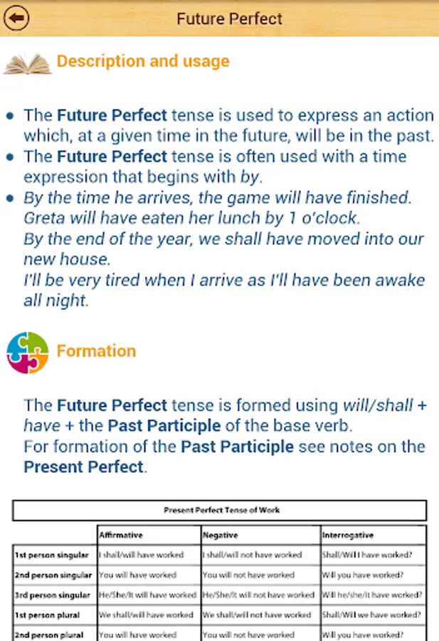 It contains over over 100 pages of lessons explaining each grammar tense with several examples.