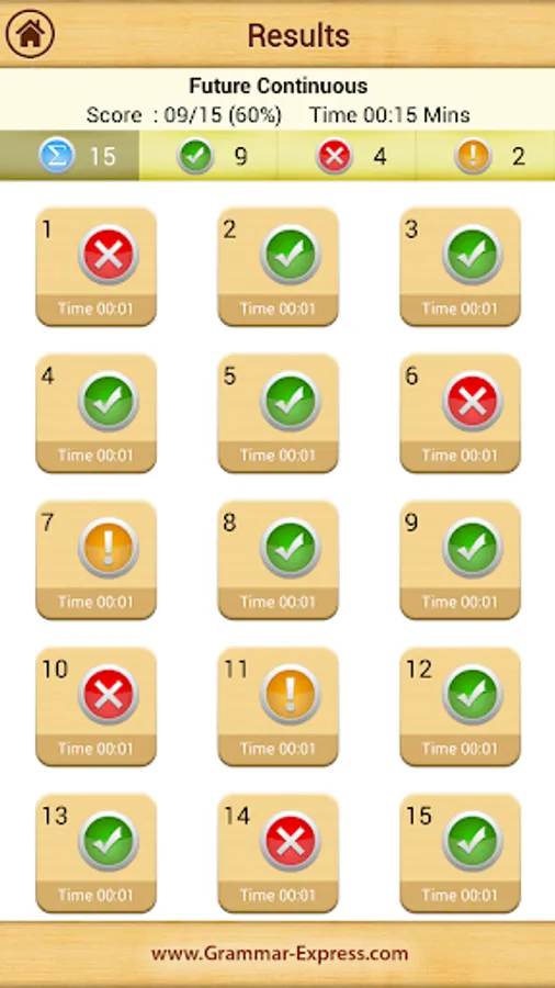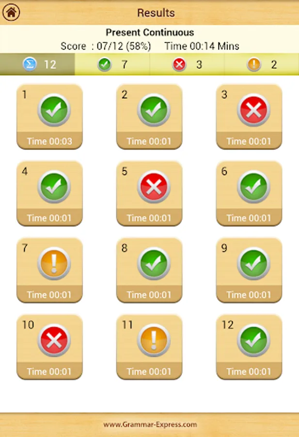 A summary of the practice test is presented at the end of each test. It shows you the time you took, the score, which questions you answered correctly and where you were wrong.