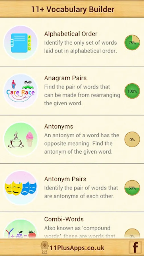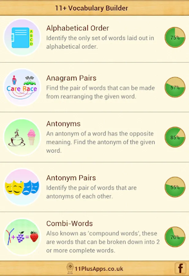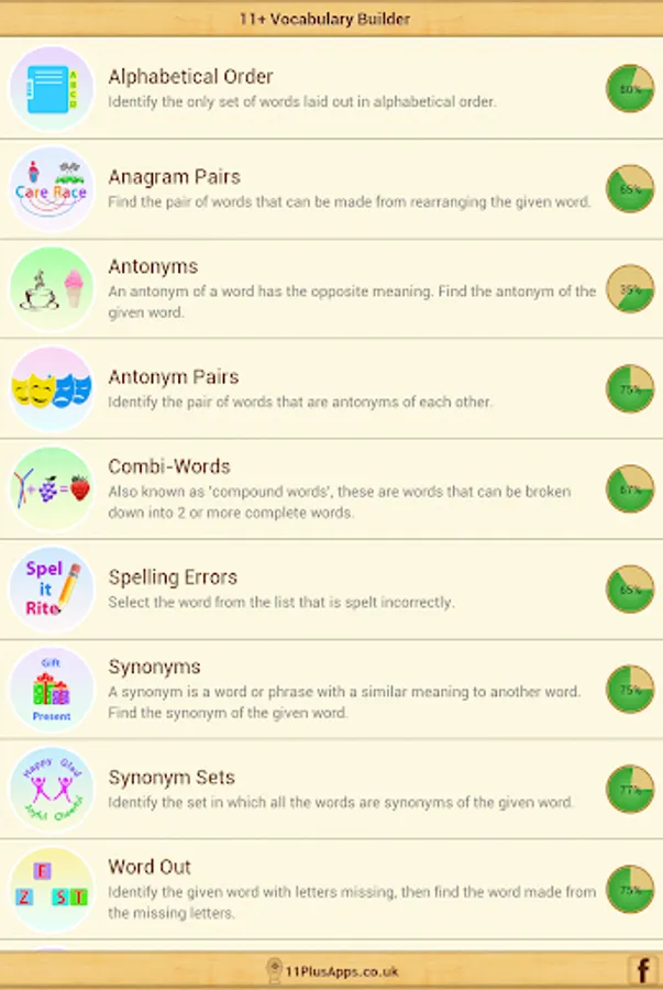 11+ Vocab Builder app helps kids to boost their vocabulary by applying various study techniques. This interactive app is designed in a quiz format and covers following topics: