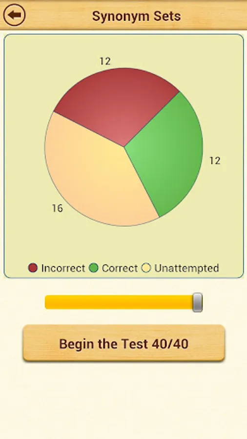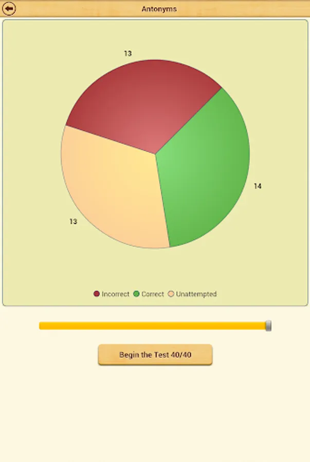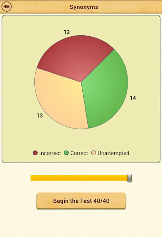 An interactive pie chart displays current progress for each topic. You can touch the different color slices of the pie and choose if you wish to answer only incorrectly answered questions, unattempted or correctly answered questions. This feature is very useful to achieve 100% score in each topic.