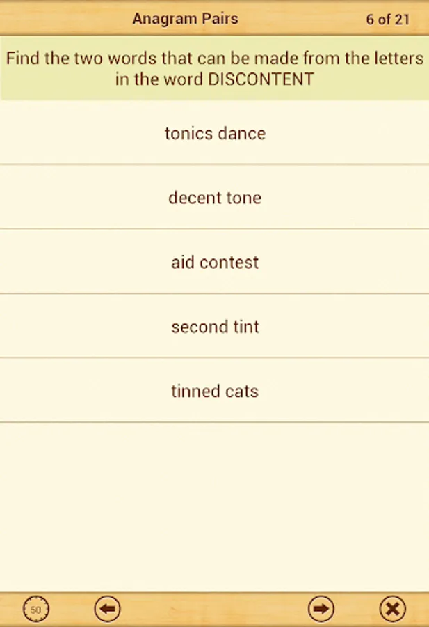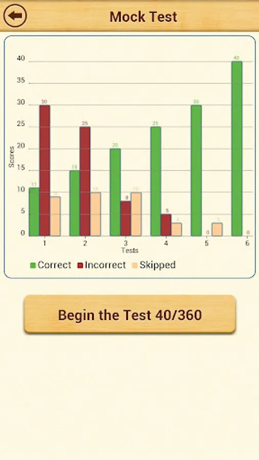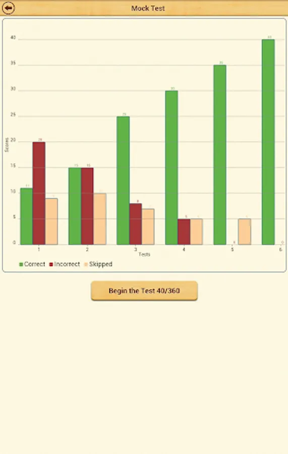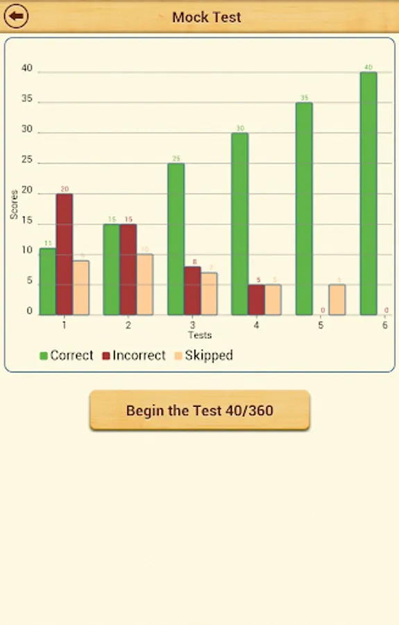 After you have practiced all types of questions, you can take a Mock Test with 50 questions. The Mock Test has questions selected randomly from each topic. Scores for the mock tests taken in the past are displayed in a bar chart. This is a great way to track how you are progressing in mock tests. There is no limit on how many mock tests you can take.