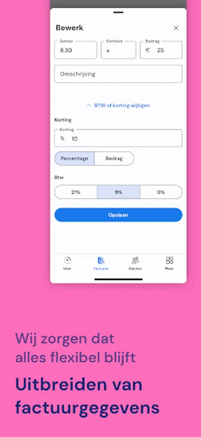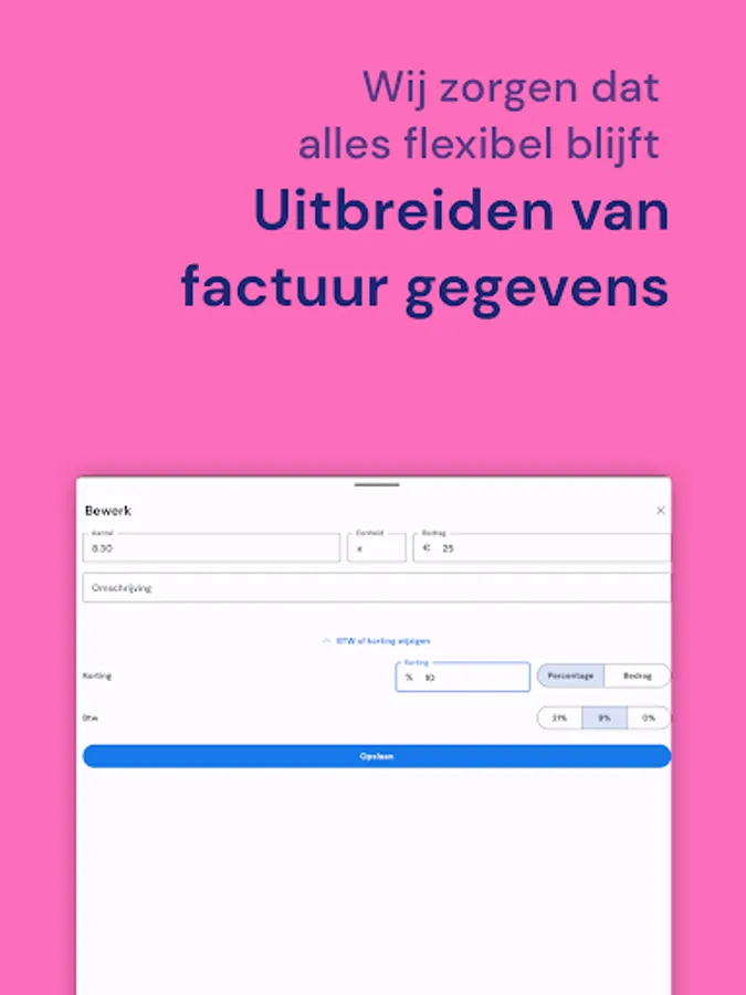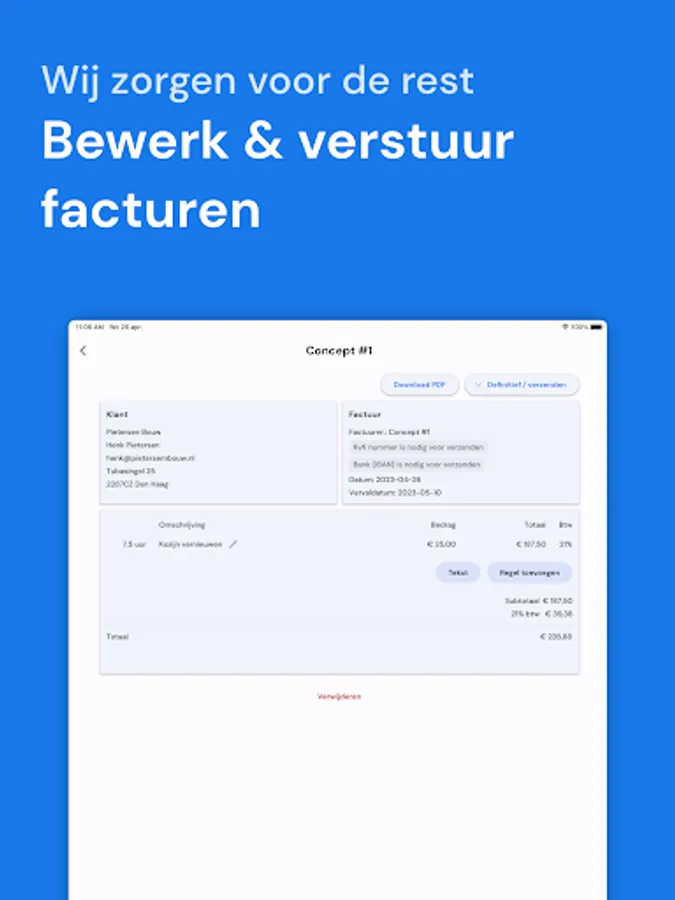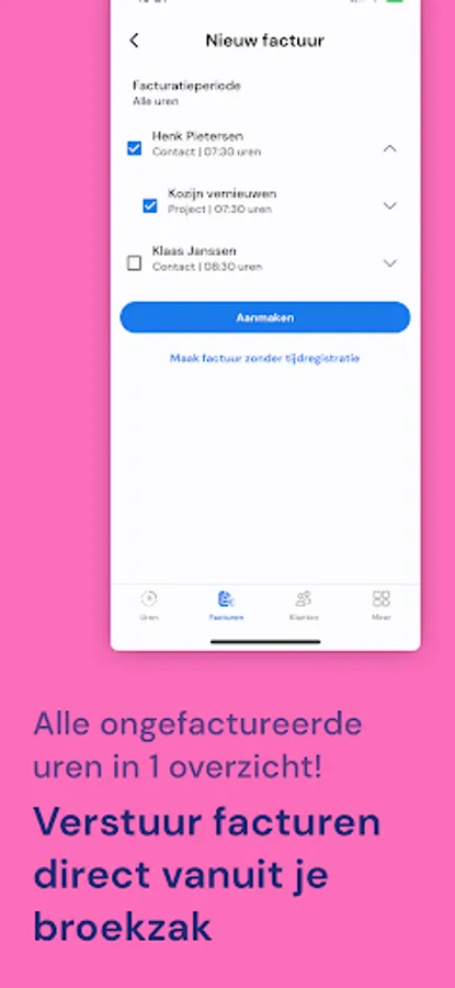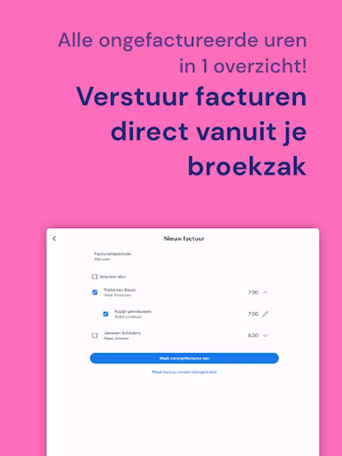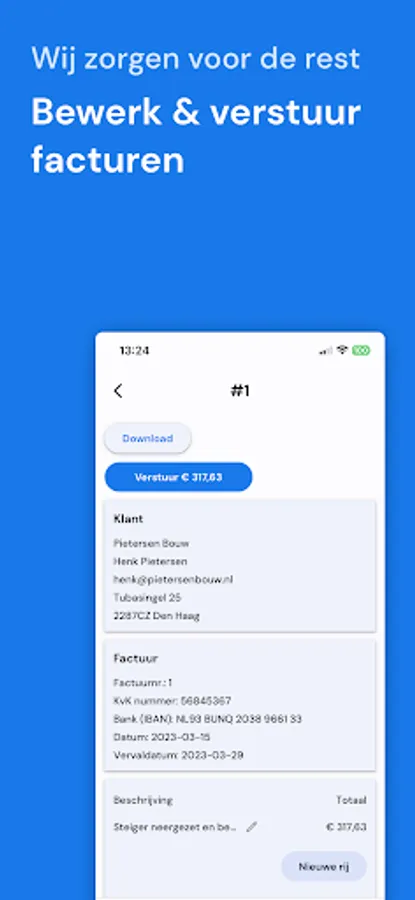 Our billing app streamlines and automates your billing and time registration process. Invoice at the touch of a button, focus on your business and let our app do the rest. Organize your invoices and time registration in one place, without complicated systems and without manual work. Invoice faster and get paid faster, while minimizing stress and administrative tasks. Discover the secret of successful freelancers and maximize your profit with our easy to use app.