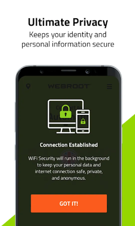 Webroot® WiFi Security is a VPN that gives you security and privacy while you work, share, bank, and browse online. But Webroot WiFi Security is different from a traditional VPN. It adds a layer of protection for your valuable information, but isn’t demanding or difficult to set up. It just takes a single tap or click to activate all your protection features, so you know your connection is secure, anonymous, and most importantly, private.