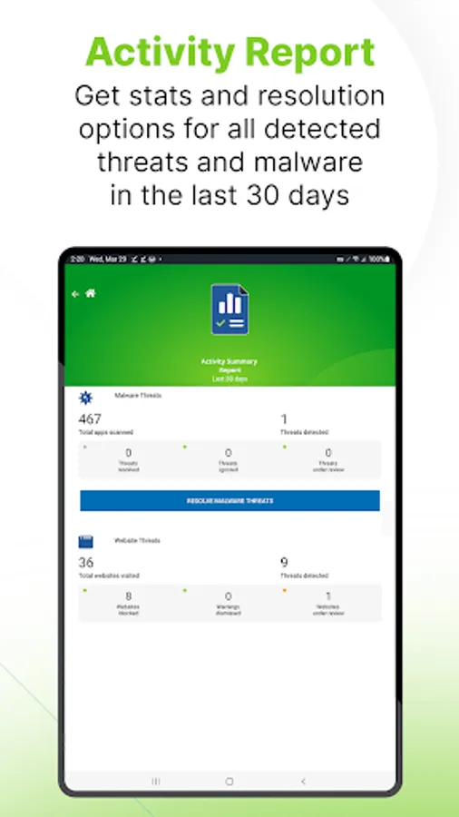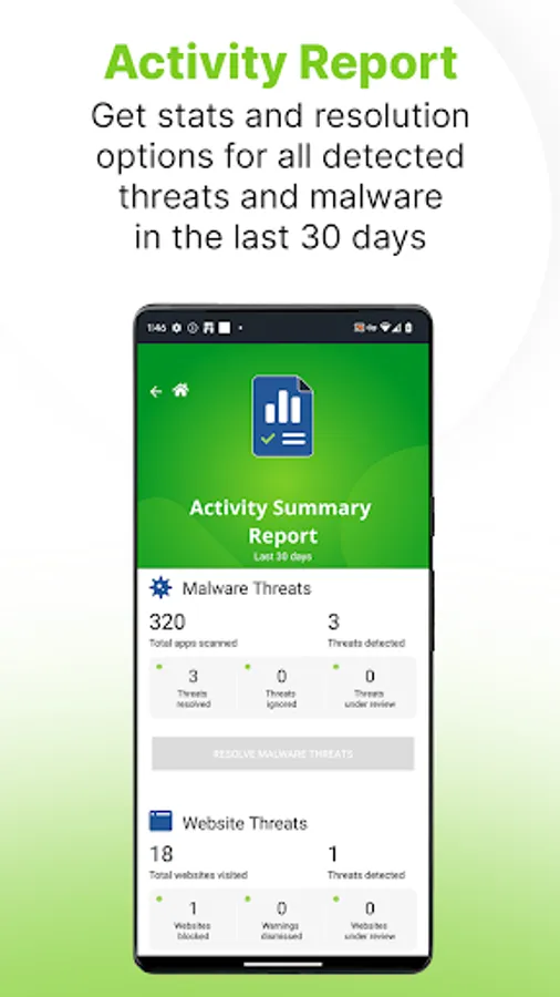 MONITOR YOUR PROTECTION: Check the activity report for get stats and resolution options for all detected threats and malware.