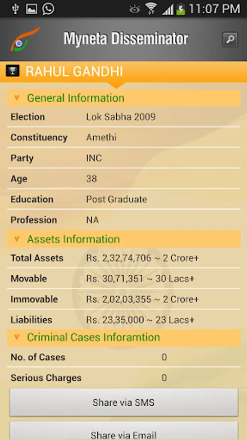 Compare background information of candidates contesting election in India and make an informed choice. Share information with your friends on Facebook, SMS, and Email at the click of a button and help them to make an informed choice as well.