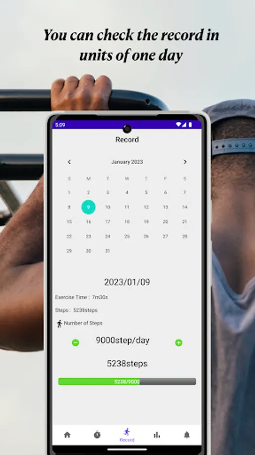Through the calendar in the app, you can view your exercise time and step count records on a daily basis.