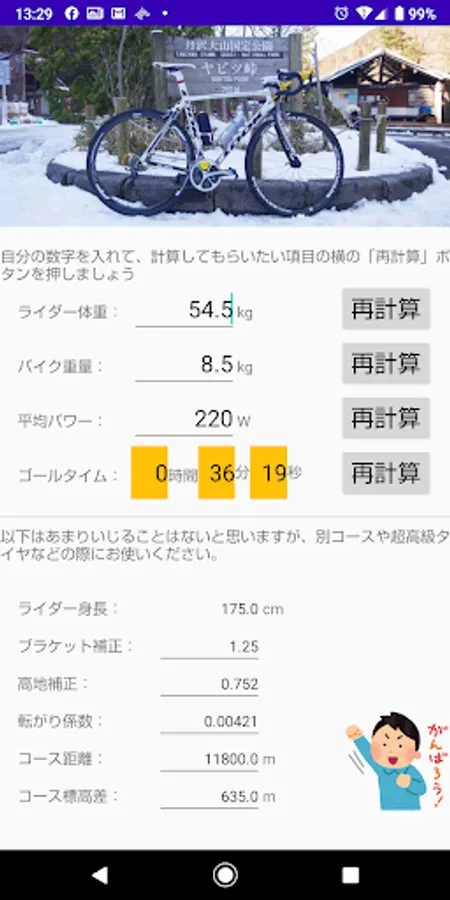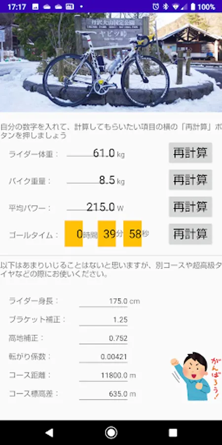自転車でヤビツ峠を上る際に、体重・車重・パワー・タイムのいずれかを、自動で計算してくれます。