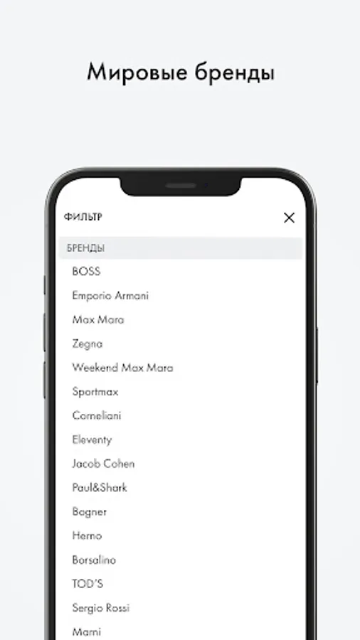 The app features a wide selection of global brands: Max Mara, Zegna, Bogner, BOSS, HUGO, Emporio Armani, Max&Co, Red Valentino, Liu Jo, Furla, Pinko, Coccinelle, Wolford, Corneliani and many more.