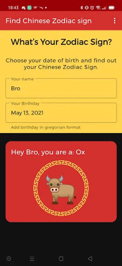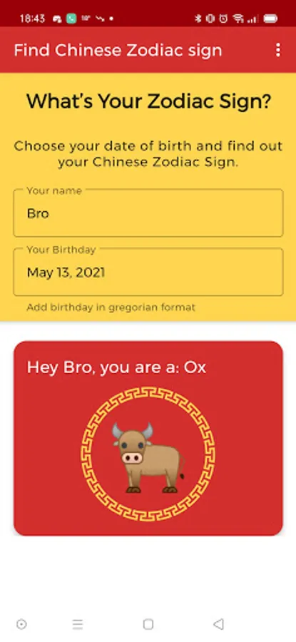You can use our zodiac calculator to search for your animal sign. Select your Gregorian date of birth in the app, and it will reveal your date of birth according to the lunar calendar, together with your chinese zodiac sign.