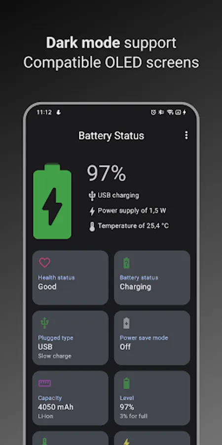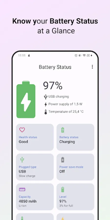 Get real-time battery values for your device, check the charging or discharging status, and the type of charging system - USB port, wireless charging pad, or power adapter. Our app also allows you to view the actual battery consumption.