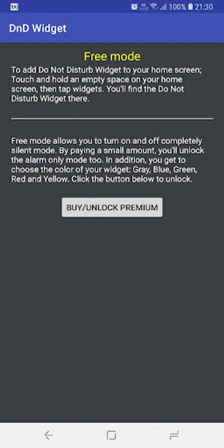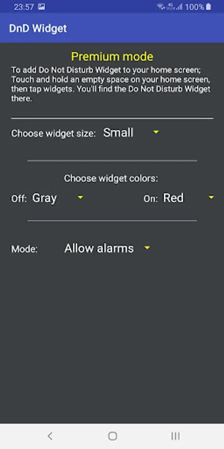By unlocking the premium version, you can also choose to allow alarms in silent mode. In addition you get to choose widget colors, and the option to use a smaller sized widget.