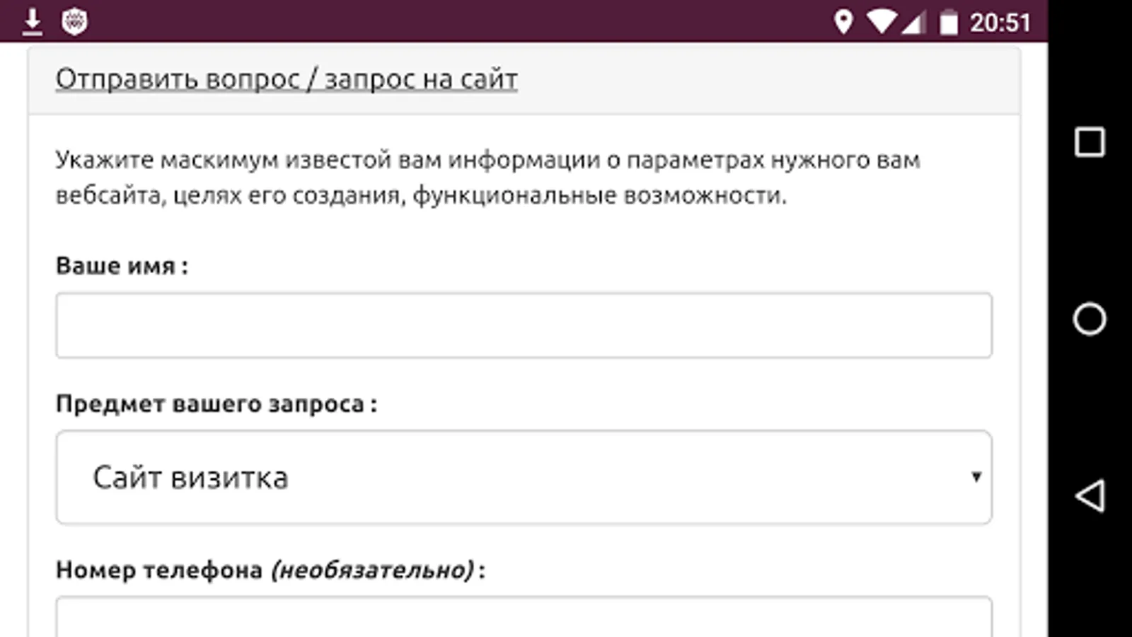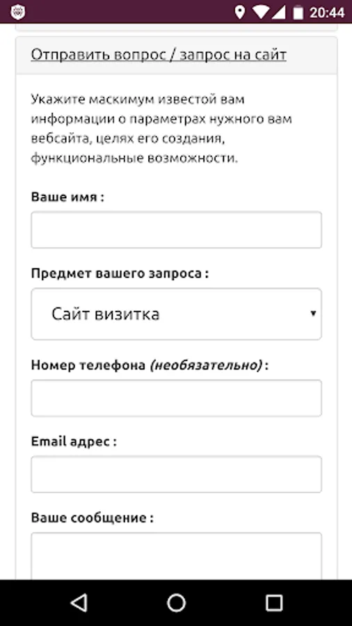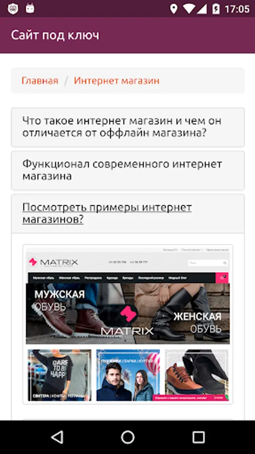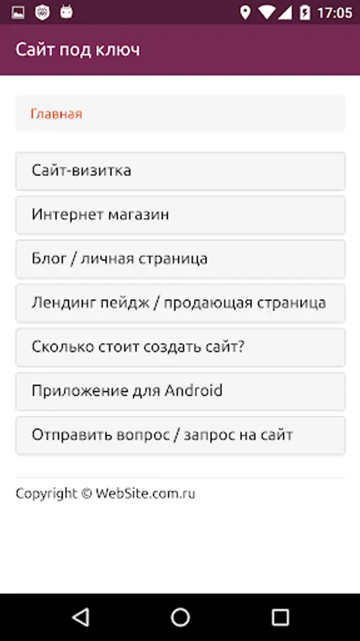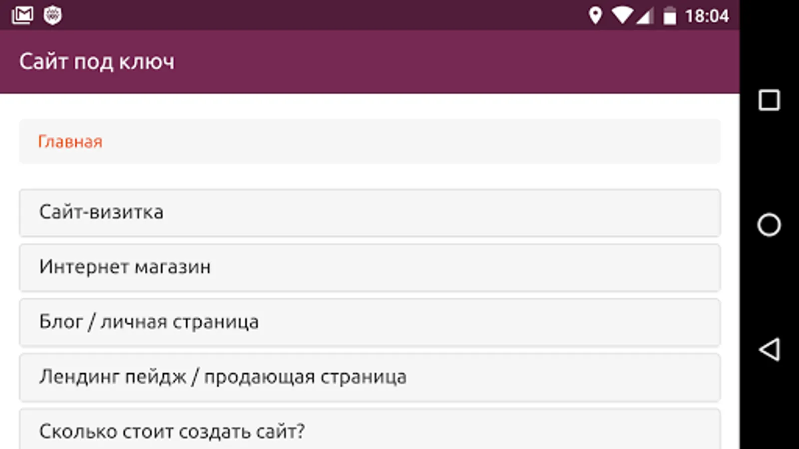 Information application that will help you understand the different types of site. It will allow to understand how they differ from each other, to see examples of their implementation, as well as send any your question or request to create a site or application under the key of our studio directly from the application.