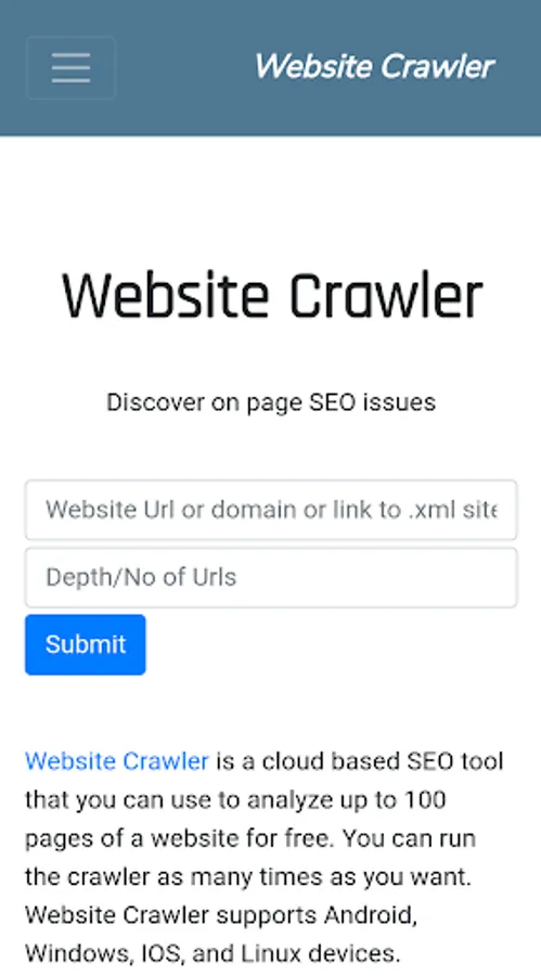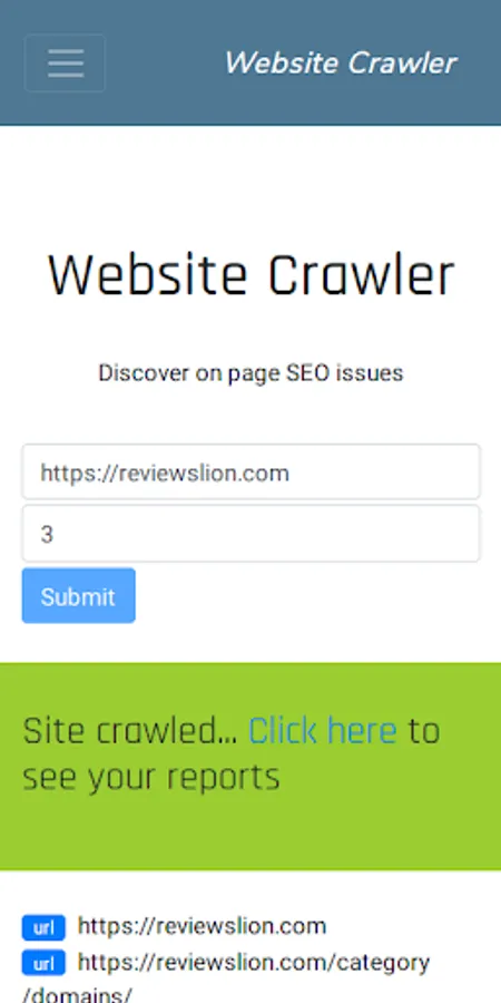 Step 1: Enter the domain name starting with https, or http in the textbox 1, the number of URLs you want WebsiteCrawler to crawl in the textbox 2 and tap the submit button.
