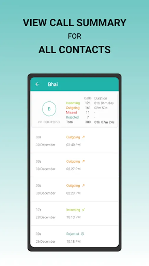 Callyzer allows the user to summarise logs by Diverse Categories like Total Calls, Incoming Calls, Outgoing Calls, Missed Calls, Today's Calls, Weekly Calls and Monthly Calls which helps user for better and ease of analysis