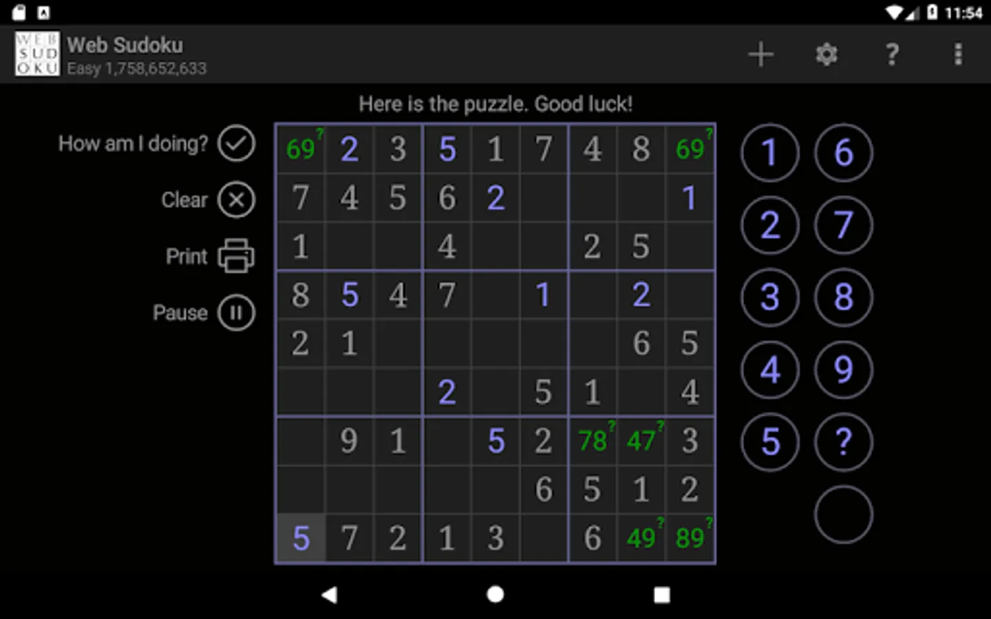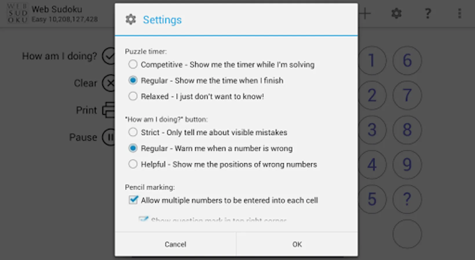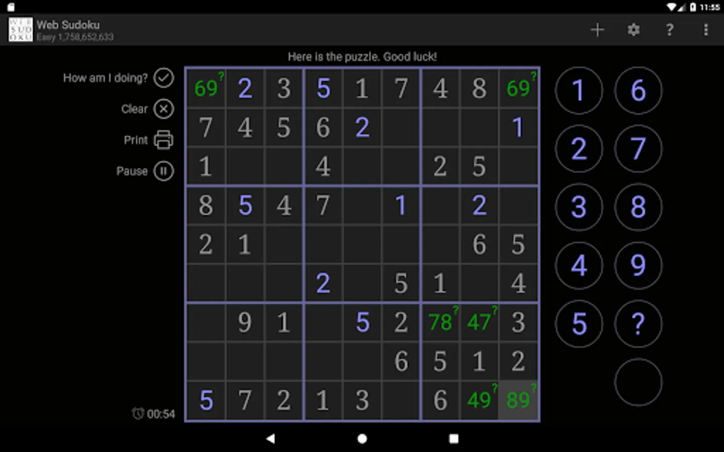 • 'Pencil marking' option for entering possible numbers in a cell.