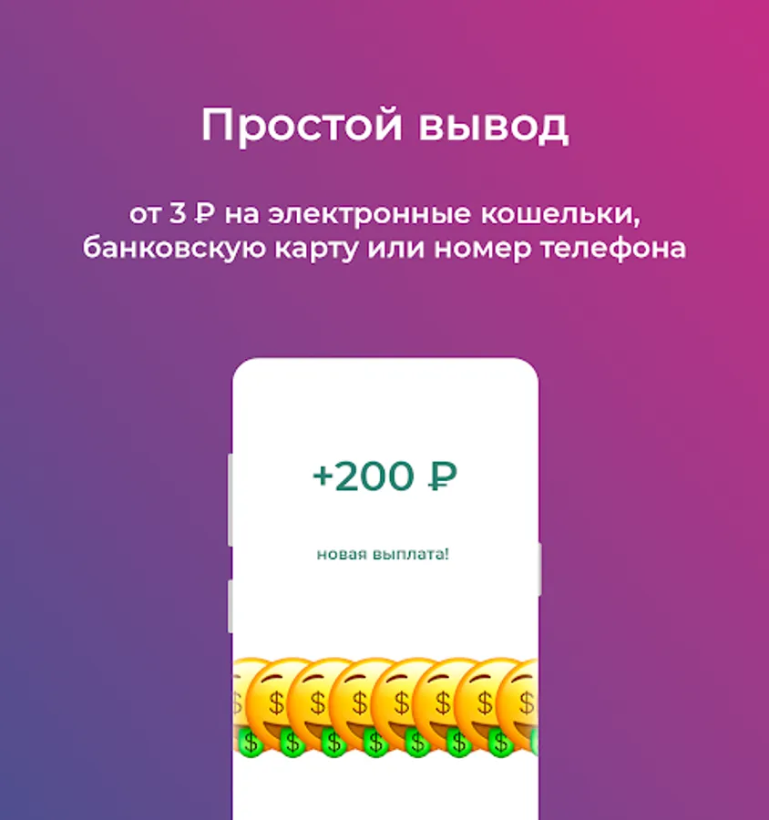Withdrawal to WebMoney, Payeer, Yandex.Money, QIWI, Visa/Mastercard, PerfectMoney and AdvCash. The minimum withdrawal amount is from 3 rubles.