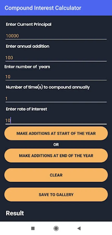 • Unique feature of Annual Addition - Unlike other compound interest calculators this app has a unique feature of Annual Addition which can help you calculate the performance of your Mutual Funds, Sytemic Investment Plans (SIP), Public Provident Funds(PPF), Goal Achieving, Retirement Planning, Life Insurance Corporation Investments (LIC) , Banking, Compounding, Recurring Deposit etc.