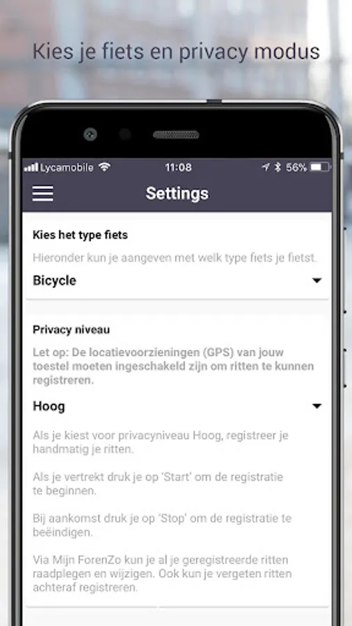 The ForenZo Fietsapp record only your commuting trips in three possible privacy settings to choose from. From fully automatic to manual start-stop. The result of your bike rides will be displayed in the dashboard of the fietsapp and also you have a complete overview, including cycled route on your personal page MijnForenZo.
