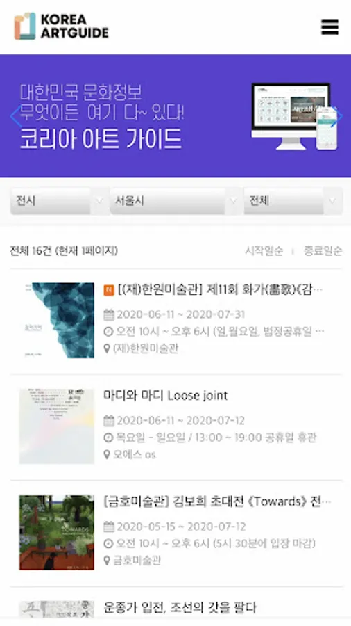 It provides a platform for uploading and sharing exhibition information in real time in art galleries and galleries that display and promote the works of artists completed through the pain of creation. And, for those who like art, it is an open service that allows you to quickly, easily, and conveniently check the exhibition information by region shared by art galleries and galleries in one place.