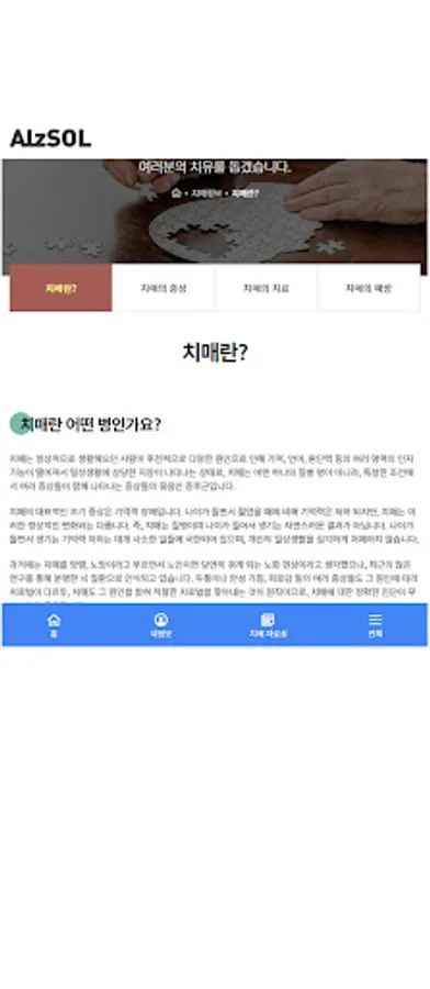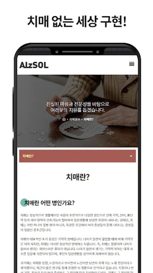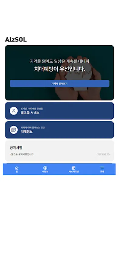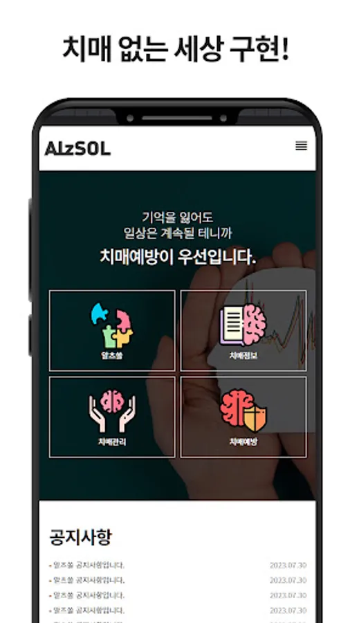 As a compound word of “Alzheimer’s Disease” and “Solution”, it refers to the world’s first platform service loaded with solution information for preventing dementia, symbolizing the mission of a GMS company leading a dementia-free world.