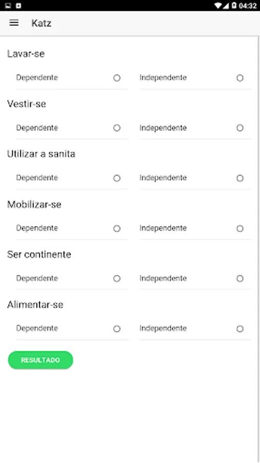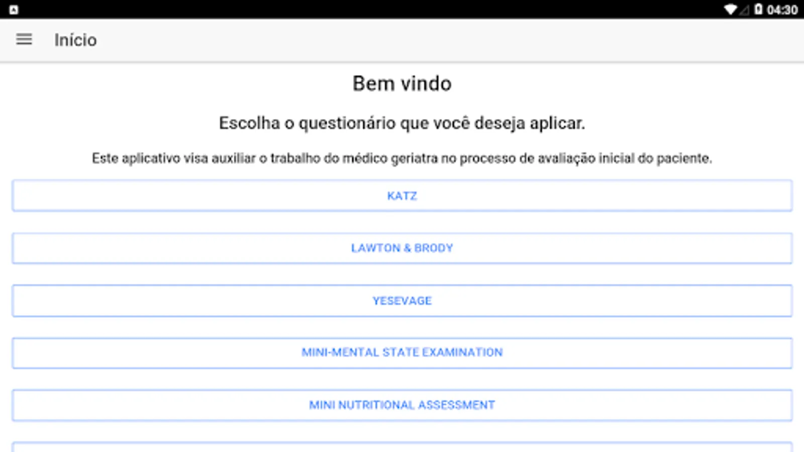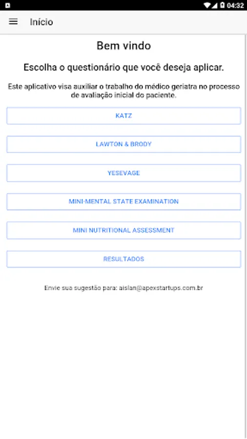 The application has questionnaires that facilitate the achievement of a result using the Katz, Lawton & Brody, Yesevage, Mini-mental state and mini bnutritional Assessment scales.